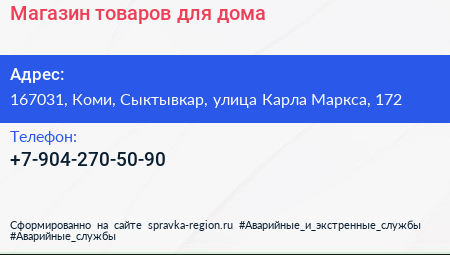 Магазин товаров для дома по адресу 167031, Коми, Сыктывкар, улица Карла Маркса, 172 в дальнейшем Организация, размещена в следующих категориях: