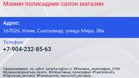 Мамин полисадник, салон-магазин по адресу 167026, Коми, Сыктывкар, улица Мира, 38а в дальнейшем Организация, размещена в следующих категориях: