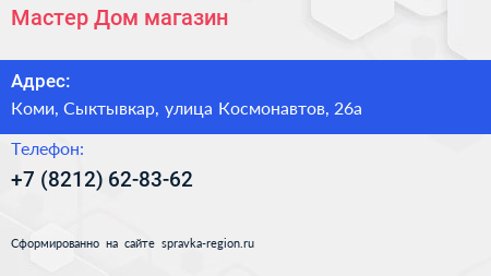 Мастер Дом, магазин по адресу Коми, Сыктывкар, улица Космонавтов, 26а в дальнейшем Организация, размещена в следующих категориях: