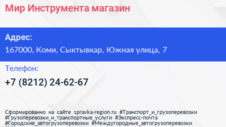 Мир Инструмента, магазин по адресу 167000, Коми, Сыктывкар, Южная улица, 7 в дальнейшем Организация, размещена в следующих категориях: