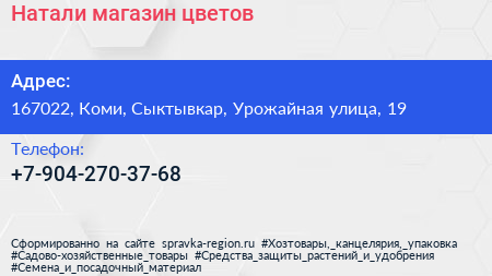 Натали, магазин цветов по адресу 167022, Коми, Сыктывкар, Урожайная улица, 19 в дальнейшем Организация, размещена в следующих категориях: