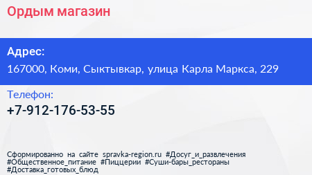 Ордым, магазин по адресу 167000, Коми, Сыктывкар, улица Карла Маркса, 229 в дальнейшем Организация, размещена в следующих категориях: