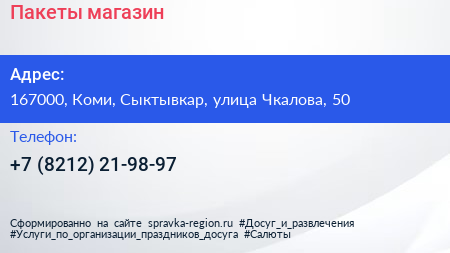 Пакеты, магазин по адресу 167000, Коми, Сыктывкар, улица Чкалова, 50 в дальнейшем Организация, размещена в следующих категориях: