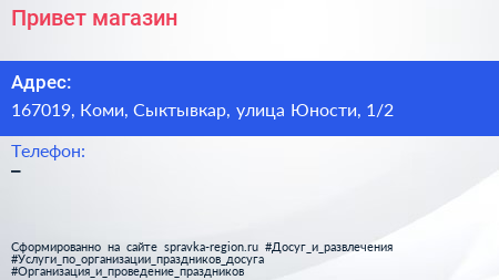 Привет, магазин по адресу 167019, Коми, Сыктывкар, улица Юности, 1/2 в дальнейшем Организация, размещена в следующих категориях: