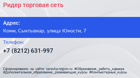 Ридер, торговая сеть по адресу Коми, Сыктывкар, улица Юности, 7 в дальнейшем Организация, размещена в следующих категориях:
