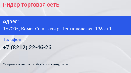 Ридер, торговая сеть по адресу 167005, Коми, Сыктывкар, Тентюковская, 136 ст1 в дальнейшем Организация, размещена в следующих категориях: