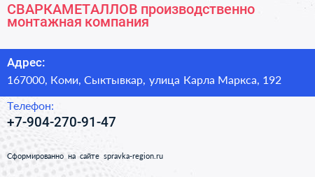 СВАРКАМЕТАЛЛОВ, производственно-монтажная компания по адресу 167000, Коми, Сыктывкар, улица Карла Маркса, 192 в дальнейшем Организация, размещена в следующих категориях: