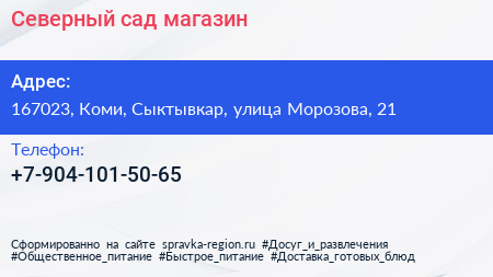 Северный сад, магазин по адресу 167023, Коми, Сыктывкар, улица Морозова, 21 в дальнейшем Организация, размещена в следующих категориях: