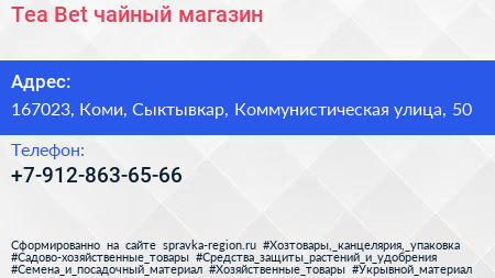 Tea Bet, чайный магазин по адресу 167023, Коми, Сыктывкар, Коммунистическая улица, 50 в дальнейшем Организация, размещена в следующих категориях: