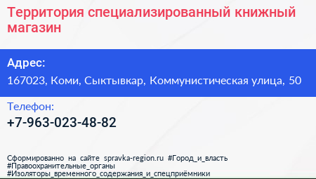 Территория, специализированный книжный магазин по адресу 167023, Коми, Сыктывкар, Коммунистическая улица, 50 в дальнейшем Организация, размещена в следующих категориях: