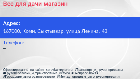 Все для дачи, магазин по адресу 167000, Коми, Сыктывкар, улица Ленина, 43 в дальнейшем Организация, размещена в следующих категориях: