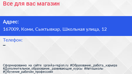 Все для вас, магазин по адресу 167009, Коми, Сыктывкар, Школьная улица, 12 в дальнейшем Организация, размещена в следующих категориях:
