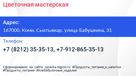 Цветочная мастерская по адресу 167000, Коми, Сыктывкар, улица Бабушкина, 31 в дальнейшем Организация, размещена в следующих категориях:
