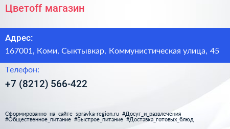 Цветоff, магазин по адресу 167001, Коми, Сыктывкар, Коммунистическая улица, 45 в дальнейшем Организация, размещена в следующих категориях: