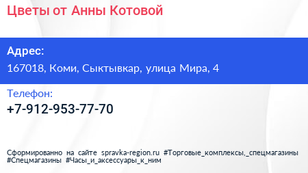 Цветы от Анны Котовой по адресу 167018, Коми, Сыктывкар, улица Мира, 4 в дальнейшем Организация, размещена в следующих категориях: