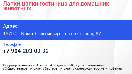 Лапки-цапки, гостиница для домашних животных по адресу 167005, Коми, Сыктывкар, Тентюковская, 87 в дальнейшем Организация, размещена в следующих категориях: