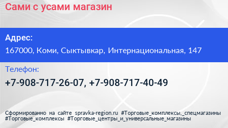 Сами с усами, магазин по адресу 167000, Коми, Сыктывкар, Интернациональная, 147 в дальнейшем Организация, размещена в следующих категориях: