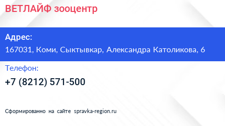 ВЕТЛАЙФ, зооцентр по адресу 167031, Коми, Сыктывкар, Александра Католикова, 6 в дальнейшем Организация, размещена в следующих категориях: