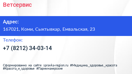 Ветсервис по адресу 167021, Коми, Сыктывкар, Емвальская, 23 в дальнейшем Организация, размещена в следующих категориях: