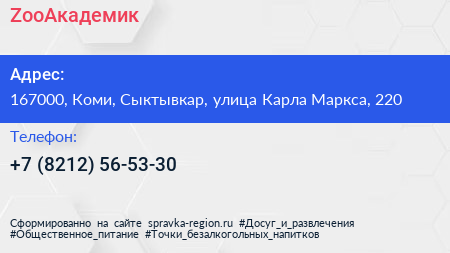 ZooАкадемик по адресу 167000, Коми, Сыктывкар, улица Карла Маркса, 220 в дальнейшем Организация, размещена в следующих категориях: