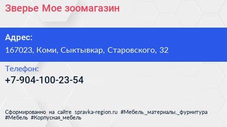 Зверье Мое, зоомагазин по адресу 167023, Коми, Сыктывкар, Старовского, 32 в дальнейшем Организация, размещена в следующих категориях: