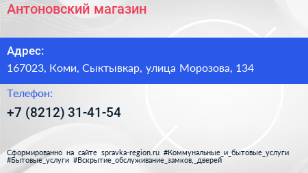 Антоновский, магазин по адресу 167023, Коми, Сыктывкар, улица Морозова, 134 в дальнейшем Организация, размещена в следующих категориях: