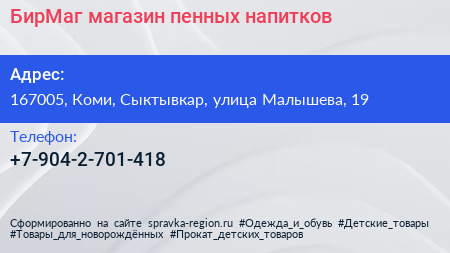 БирМаг, магазин пенных напитков по адресу 167005, Коми, Сыктывкар, улица Малышева, 19 в дальнейшем Организация, размещена в следующих категориях: