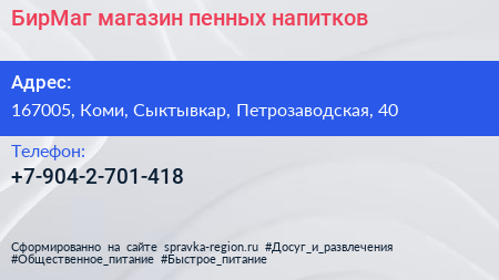 БирМаг, магазин пенных напитков по адресу 167005, Коми, Сыктывкар, Петрозаводская, 40 в дальнейшем Организация, размещена в следующих категориях: