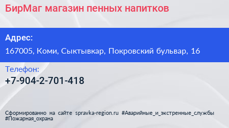 БирМаг, магазин пенных напитков по адресу 167005, Коми, Сыктывкар, Покровский бульвар, 16 в дальнейшем Организация, размещена в следующих категориях: