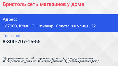 Бристоль, сеть магазинов у дома по адресу 167000, Коми, Сыктывкар, Советская улица, 22 в дальнейшем Организация, размещена в следующих категориях: