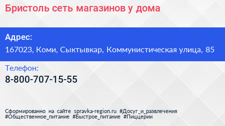 Бристоль, сеть магазинов у дома по адресу 167023, Коми, Сыктывкар, Коммунистическая улица, 85 в дальнейшем Организация, размещена в следующих категориях: