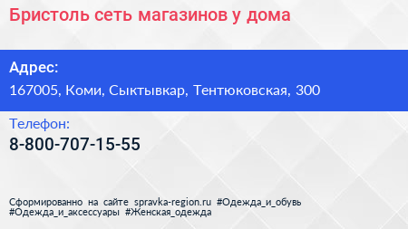 Бристоль, сеть магазинов у дома по адресу 167005, Коми, Сыктывкар, Тентюковская, 300 в дальнейшем Организация, размещена в следующих категориях: