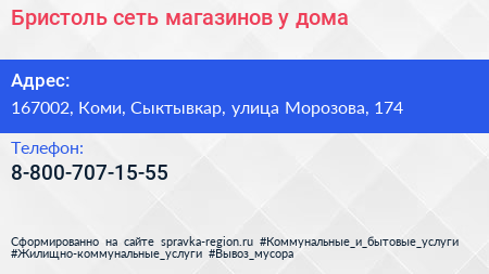 Бристоль, сеть магазинов у дома по адресу 167002, Коми, Сыктывкар, улица Морозова, 174 в дальнейшем Организация, размещена в следующих категориях: