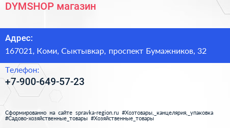 DYMSHOP, магазин по адресу 167021, Коми, Сыктывкар, проспект Бумажников, 32 в дальнейшем Организация, размещена в следующих категориях: