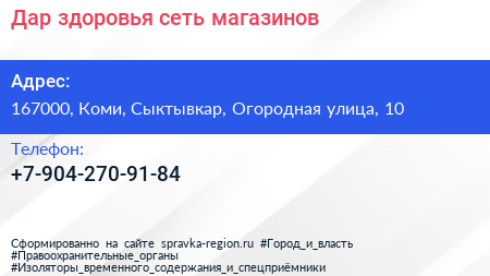 Дар здоровья, сеть магазинов по адресу 167000, Коми, Сыктывкар, Огородная улица, 10 в дальнейшем Организация, размещена в следующих категориях: