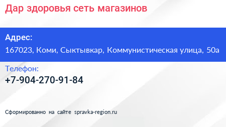 Дар здоровья, сеть магазинов по адресу 167023, Коми, Сыктывкар, Коммунистическая улица, 50а в дальнейшем Организация, размещена в следующих категориях: