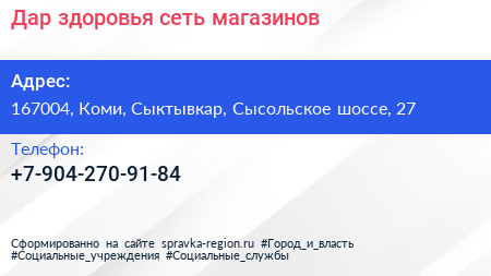 Дар здоровья, сеть магазинов по адресу 167004, Коми, Сыктывкар, Сысольское шоссе, 27 в дальнейшем Организация, размещена в следующих категориях: