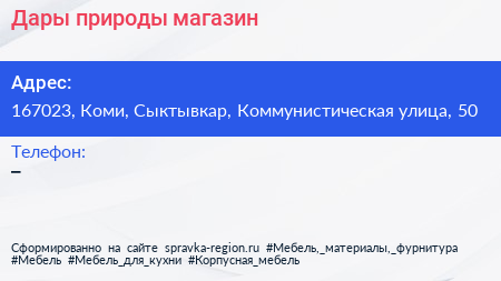 Дары природы, магазин по адресу 167023, Коми, Сыктывкар, Коммунистическая улица, 50 в дальнейшем Организация, размещена в следующих категориях: