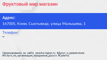 Фруктовый мир, магазин по адресу 167005, Коми, Сыктывкар, улица Малышева, 1 в дальнейшем Организация, размещена в следующих категориях: