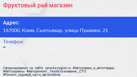 Фруктовый рай, магазин по адресу 167000, Коми, Сыктывкар, улица Пушкина, 21 в дальнейшем Организация, размещена в следующих категориях: