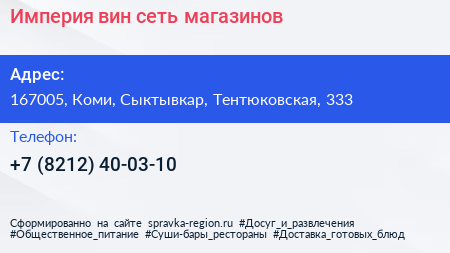 Империя вин, сеть магазинов по адресу 167005, Коми, Сыктывкар, Тентюковская, 333 в дальнейшем Организация, размещена в следующих категориях: