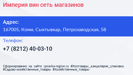 Империя вин, сеть магазинов по адресу 167005, Коми, Сыктывкар, Петрозаводская, 58 в дальнейшем Организация, размещена в следующих категориях: