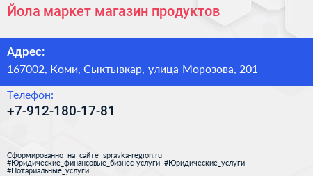 Йола-маркет, магазин продуктов по адресу 167002, Коми, Сыктывкар, улица Морозова, 201 в дальнейшем Организация, размещена в следующих категориях: