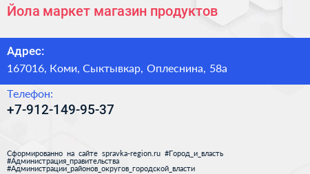 Йола-маркет, магазин продуктов по адресу 167016, Коми, Сыктывкар, Оплеснина, 58а в дальнейшем Организация, размещена в следующих категориях: