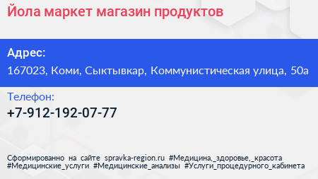 Йола-маркет, магазин продуктов по адресу 167023, Коми, Сыктывкар, Коммунистическая улица, 50а в дальнейшем Организация, размещена в следующих категориях: