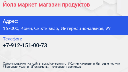 Йола-маркет, магазин продуктов по адресу 167000, Коми, Сыктывкар, Интернациональная, 99 в дальнейшем Организация, размещена в следующих категориях: