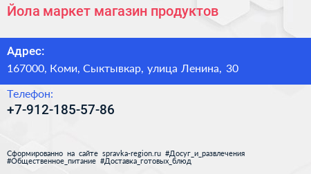 Йола-маркет, магазин продуктов по адресу 167000, Коми, Сыктывкар, улица Ленина, 30 в дальнейшем Организация, размещена в следующих категориях: