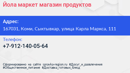 Йола-маркет, магазин продуктов по адресу 167031, Коми, Сыктывкар, улица Карла Маркса, 111 в дальнейшем Организация, размещена в следующих категориях: