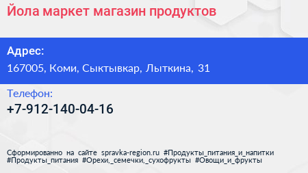 Йола-маркет, магазин продуктов по адресу 167005, Коми, Сыктывкар, Лыткина, 31 в дальнейшем Организация, размещена в следующих категориях: