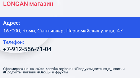 LONGAN, магазин по адресу 167000, Коми, Сыктывкар, Первомайская улица, 47 в дальнейшем Организация, размещена в следующих категориях: